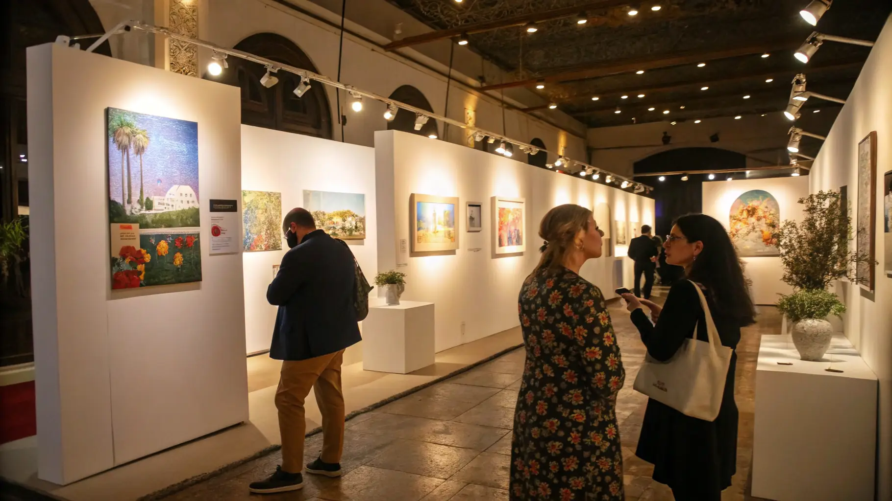 A dynamic image of an art exhibition, showcasing various paintings and sculptures, with people admiring the artwork and engaging in conversations. The scene reflects the artistic expression and cultural exchange.